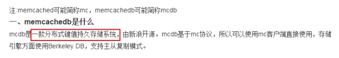- 典故:主要是sina公司发现memcache本身不支持高可用,单独为其开发了一个高可用的插件(MemcacheDB)定期的把memcache内存里面的数据同步的写到磁盘上面。